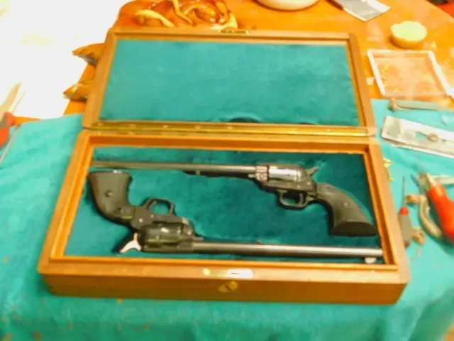 A handcrafted wooden display case featuring a teal velvet-lined interior, designed to hold two long-barrel revolvers. The case is shown open on a workbench, highlighting the custom woodworking and precise fit for the firearms. The exterior is made of polished wood with brass hinges, demonstrating high-quality custom cabinetry and woodworking skills.