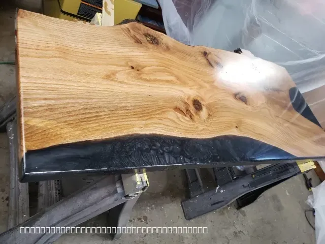 A high-gloss finished live edge wood slab featuring a deep black epoxy resin pour along the natural curves of the timber. The wood shows beautiful natural grain patterns and knots, resting on sawhorses in a workshop environment during the final stages of production.