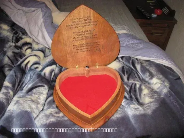 A beautiful handcrafted heart-shaped wooden box with a hinged lid. The interior of the box is lined with vibrant red felt, and the inside of the lid features a personalized engraved poem or message. The box is shown open, resting on a patterned blanket, highlighting the detailed woodworking and custom engraving services provided by D's Custom Woodworks and Services LLC.