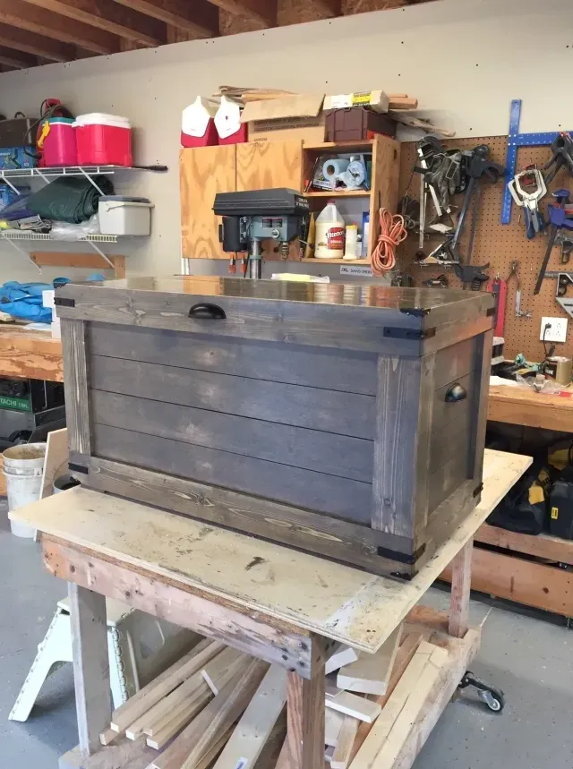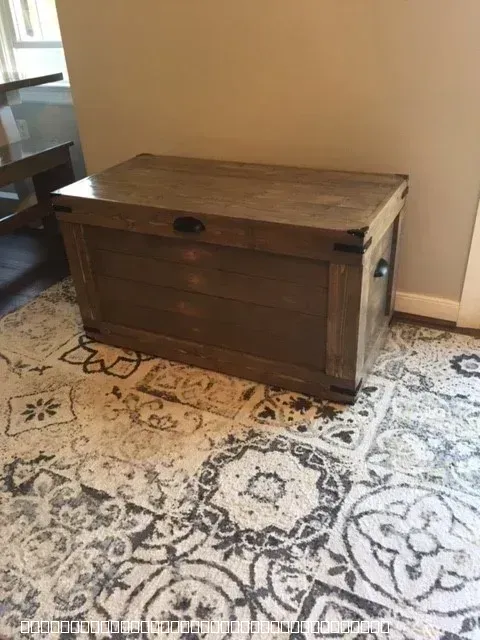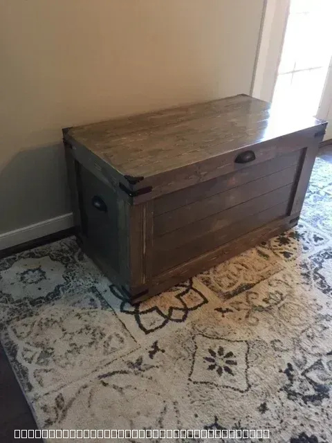 A beautifully finished custom wooden storage chest featuring a rustic design with dark metal hardware accents. The chest is constructed from stained wood planks and sits on a patterned area rug against a neutral wall. It showcases high-quality craftsmanship with reinforced corners and sturdy handles, serving as both a functional storage solution and a decorative furniture piece.