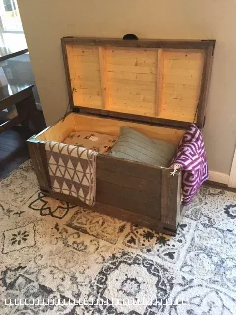 A beautifully handcrafted wooden storage chest with an open lid, showcasing its spacious interior filled with pillows and blankets. The chest features a rustic dark wood exterior finish with a natural light wood interior. It is positioned on a patterned area rug in a living room setting, demonstrating both functional storage and aesthetic appeal. The craftsmanship highlights the quality of custom woodwork provided by D's Custom Woodworks and Services LLC.