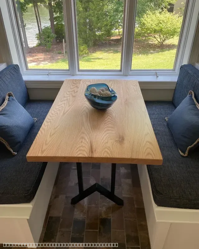 A beautifully crafted custom wood dining table with a natural grain finish, supported by a modern black metal base. The table is situated between two built-in bench seats with blue cushions, positioned in front of a large window overlooking a scenic lake view. This setup demonstrates high-quality custom cabinetry and furniture design integrated into a home's breakfast nook or dining area.